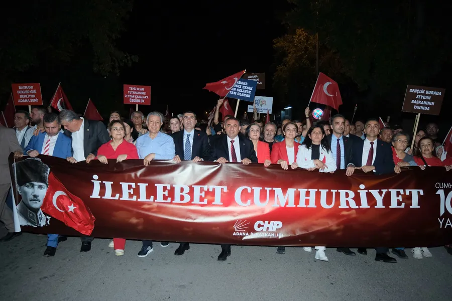 ” Adana’da Cumhuriyet coşkusu bulvarlara ve alanlara sığmadı Adana Büyükşehir Belediyesi ve ilçe belediyelerince gerçekleştirilen 29 Ekim Cumhuriyet Bayramı kutlamaları muhteşem görüntülere sahne oldu. Cumhuriyetin 102. Kuruluş Yıldönümü Kutlamalarında on binlerce Adanalı, Adana Büyükşehir Belediyesi önünde toplandı ve saat 19:23’te Uğur Mumcu Meydanı’na doğru, ellerinde meşaleler ve pankartlarla yürüyüşe geçti. Yürüyüşe Adana Büyükşehir Belediye Başkan Vekili Güngör Geçer, CHP Adana Milletvekilleri, ilçe belediye başkanları, siyasiler ve Adanalılar katıldı. Kortejde protokol; “İlelebet Cumhuriyet” yazılı pankart taşıdı.