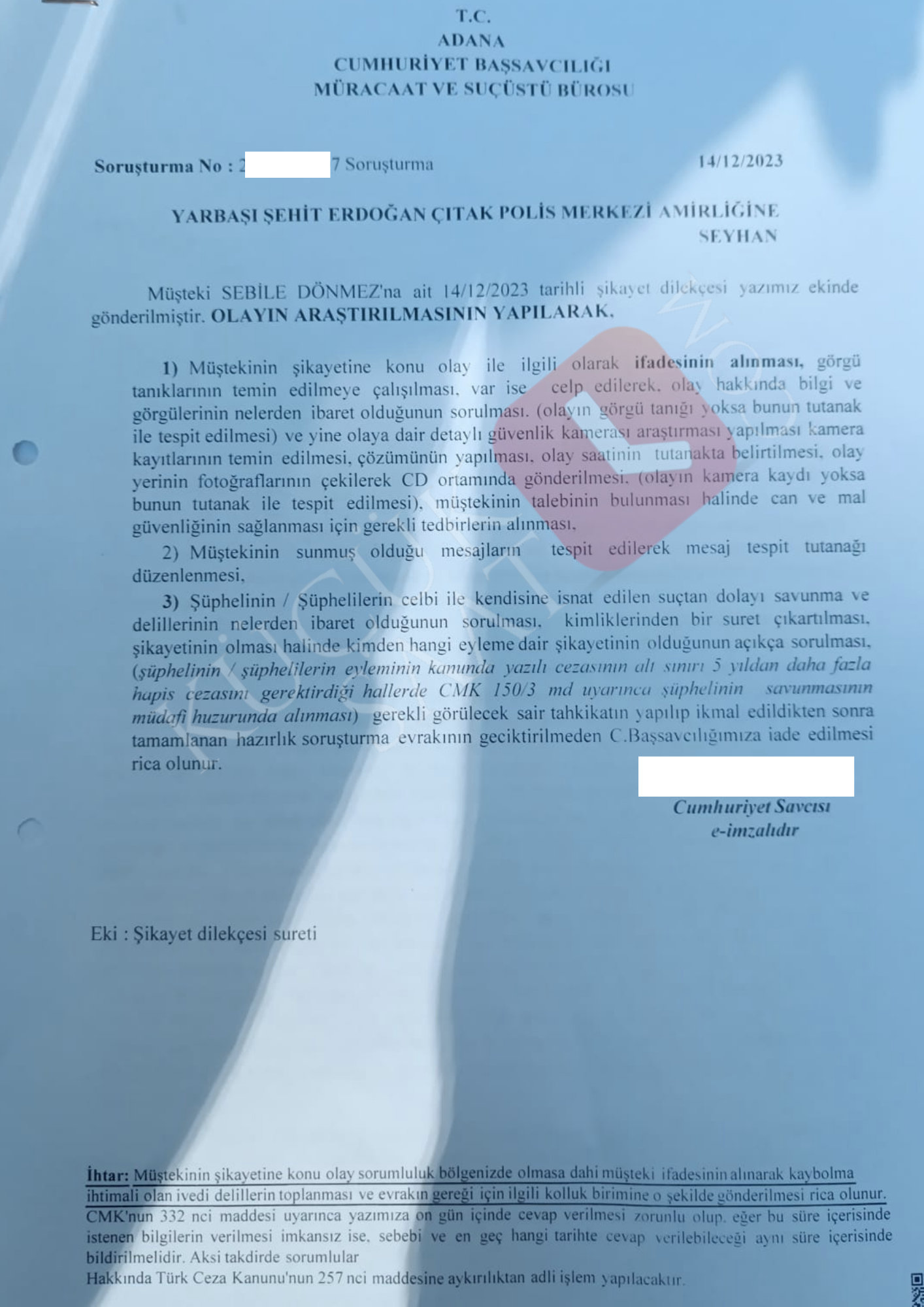 . Savcılık, O. D. E.'nin S. D.'ye gönderdiği mesajların, varsa kamera kayıtlarının ve görgü tanıklarının toplanması talimatını verdi.