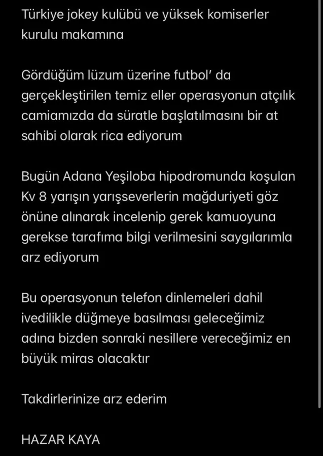 İçişleri Bakanlığı ve Emniyet Genel Müdürlüğü’nü de paylaşımına etiketleyen Kaya, at yarışlarında da tıpkı futbolda olduğu gibi ‘temiz eller operasyonunun’ başlamasını istedi: