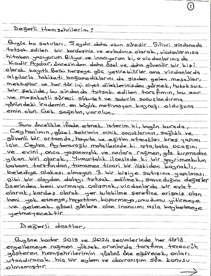 Ceyhan Belediye Başkanı Kadir Aydar, 5 aydan uzun süredir tutuklu bulunduğu Silivri Cezaevi’nden kapsamlı bir açıklama yayımlayarak kendisine yöneltilen suçlamaların gerçeği yansıtmadığını belirtti. Aydar, mektubunda hemşehrilerine seslenerek süreç boyunca kendisine gösterilen destek için teşekkür etti ve “Vicdanlar gerçeği bilir, bu hukuksuzluk beni yolumdan döndüremez” ifadelerini kullandı.