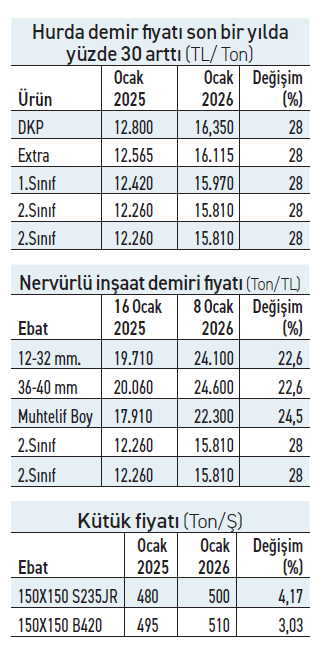 Ocak 2025-Ocak 2026 tarihleri arasındaki verilere göre, hurda demirin tüm kalemlerinde ciddi fiyat artışları yaşandı. Üretimde hammadde olarak hurda kullanan demir çelik sektörünün ham madde maliyeti son bir yılda yüzde 30 arttı. Türkiye’nin önemli demir çelik üreticisi Kardemir’in hurda alım fiyatlarına göre, DKP hurda demirin tonu 12 bin 800 liradan 16 bin 350 liraya yükseldi. Extra hurda 12 bin 565 liradan 16 bin 115 liraya, 1. sınıf hurda 12 bin 420 liradan 15 bin 970 liraya çıktı. 2. sınıf hurda demirde ise fiyatlar 12 bin 260 liradan 15 bin 810 liraya yükseldi.