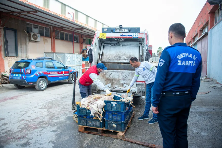 Ele geçirilen yüzlerce karkas tavuk ölüsü, halk sağlığına yönelik tehlike oluşturmaması için derhal Seyhan Belediyesi Temizlik İşleri Müdürlüğü ekiplerine teslim edildi. Temizlik İşleri ekipleri de kokmuş ve bozulmuş tavukları toplayarak, hijyen kurallarına uygun şekilde imha işlemini gerçekleştirdi.