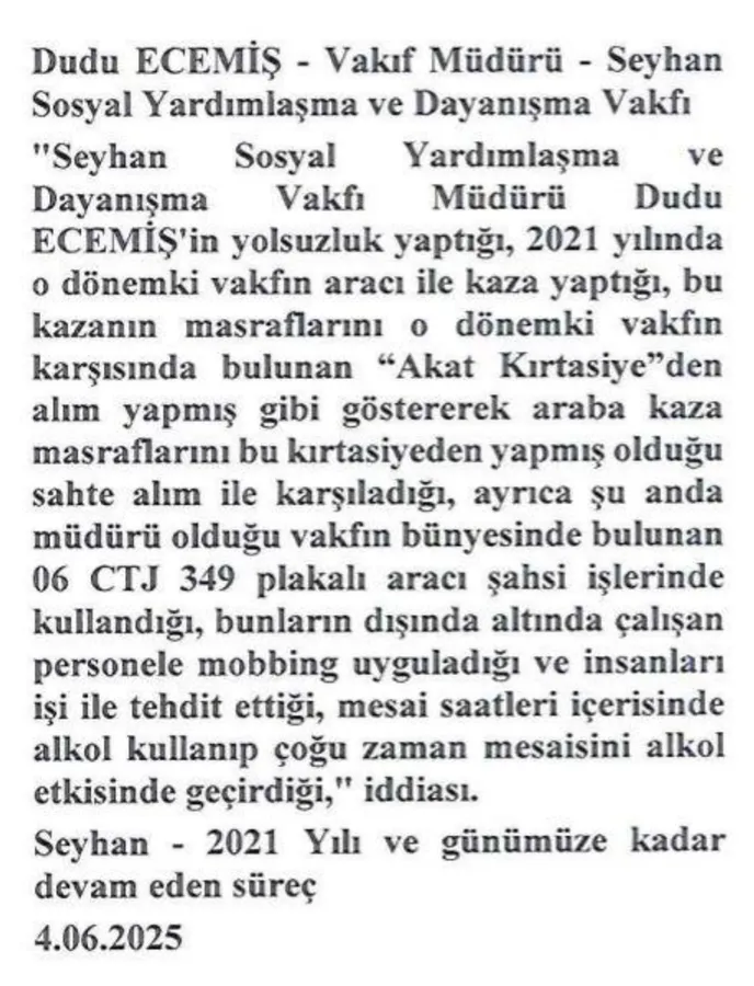 Seyhan Kaymakamlığına bağlı Seyhan Sosyal Yardımlaşma ve Dayanışma Vakfı Müdürü Dudu Ecemiş ,ile ilgili iddialar adeta ta skandalları da beraberinde getirmiş