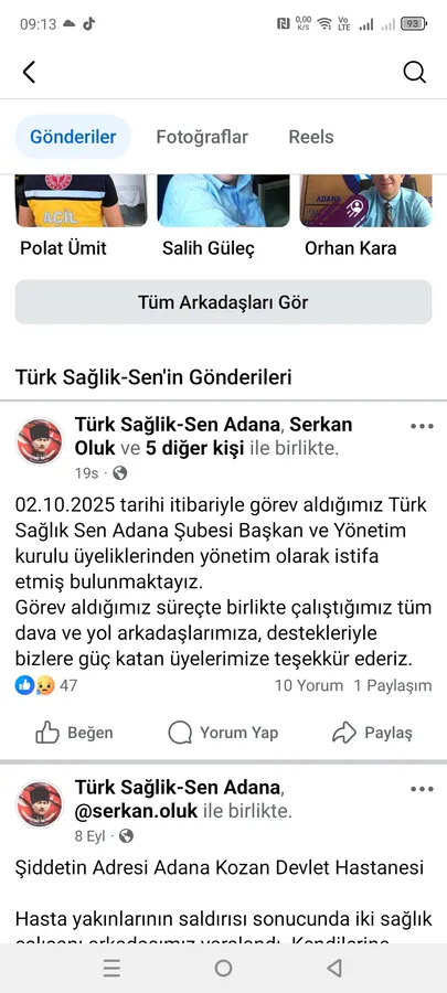 Türk sağlık sen Adana şube Başkanı Serkan Oluk ve yönetimi dün akşam saatlerinde sosyal medyada yönetim olarak görevlerinden istifa ettiklerini sosyal medyadan duyurdu