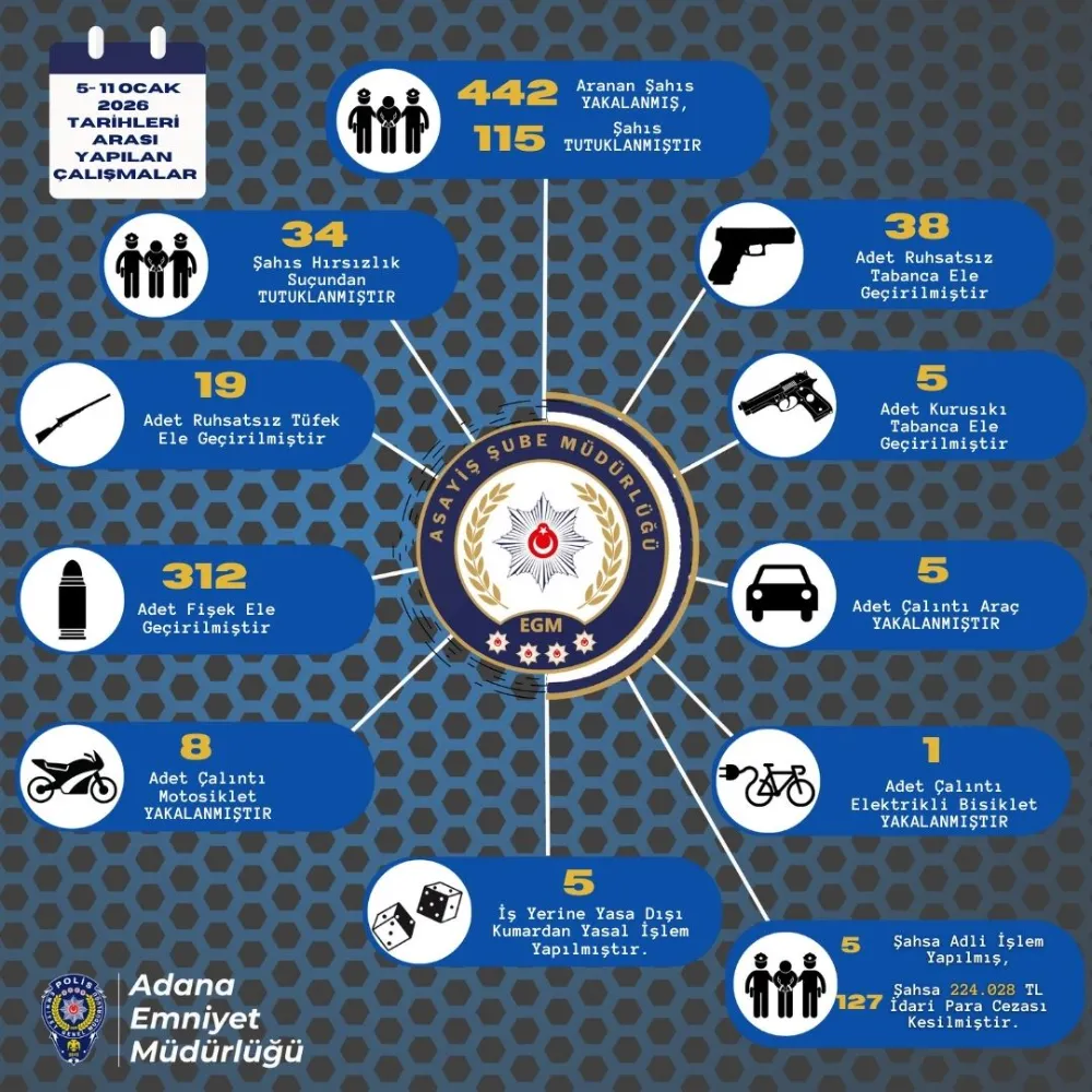 Adana Emniyet Müdürlüğü Asayiş Şube Müdürlüğü, 2026 yılının ilk günlerinde şehrin huzur ve güvenliğini sağlamak için yürüttüğü operasyonlarla suç ve suçlulara geçit vermedi. 5-11 Ocak tarihleri arasında gerçekleştirilen yoğun çalışmalarda, aranan çok sayıda kişi kıskıvrak yakalandı; kesinleşmiş hapis cezası bulunanlar ise adli mercilerce tutuklanarak cezaevine gönderildi.