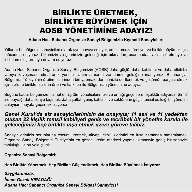 Adana OSB'de 2026 yılında seçimler yapılacak. Mevcut başkan Bekir Sütçü'ye rakip olarak Adanalı iş insanı İmam Gazali Hıradağı rakip çıktı.