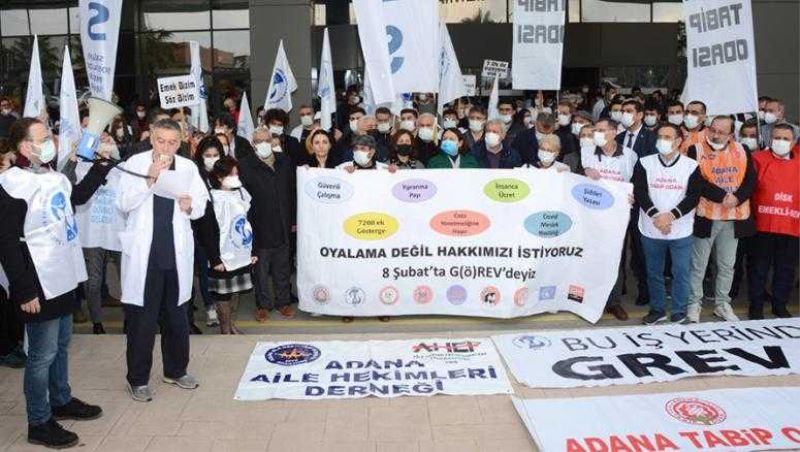 Adana Tabip Odasi Genel Sekreteri Dr. Ahmet Suntur ve TTB 2. Baskani Doç. Dr. Ali Ihsan Ökten’in okudugu ortak metinde “Sagligi alinip satilan bir meta, hastaneleri isletme, hastalari müsteri ve saglik çalisanlarini köle olarak gören anlayisin yürürlüge koydugu saglikta dönüsüm programi ile, saglik emekçilerinin emegi ucuzlatilmis, çalisma kosullari kötülesmis halkin saglik hakki elinden alinmis gelinen asamada saglik sistemi islemez hale gelmistir.” denildi.