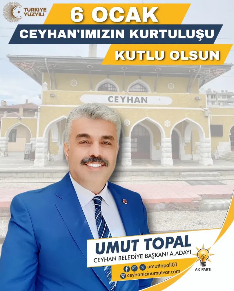 Başkan a.Adayı Topal “Bugün 102. yılını kutladığımız 6 Ocak Ceyhan’ımızın düşman işgalinden kurtuluş günü, aziz şehrimizin sadece bir kurtuluş günü değil aynı zamanda bu milletin esir edilemeyeceğinin dost düşman bütün dünyaya haykırıldığı günün adıdır” dedi.