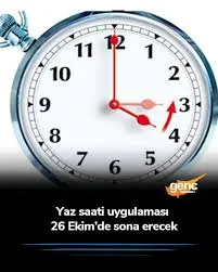 Gün ışığından daha fazla yararlanmak amacıyla uygulanan yaz saati uygulaması, 26 Ekim Pazar günü sona erecek, saat 04.00’te saatler bir saat geri alınacak.