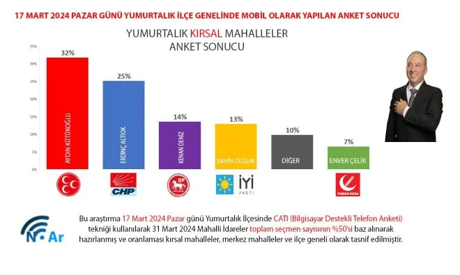 17 Mart Pazar günü Yumurtalık ilçesi CATI Bilgisayar Destekli telefon anketi. tekniği kullanılarak 31 Mart 2024 Mahalli idareler toplam seçmen sayısının Yüzde 50'i baz alınarak hazırlanmış ve oranlanmış, kırsal mahalleler ve ilçe geneli olarak tasnif edilmiştir.